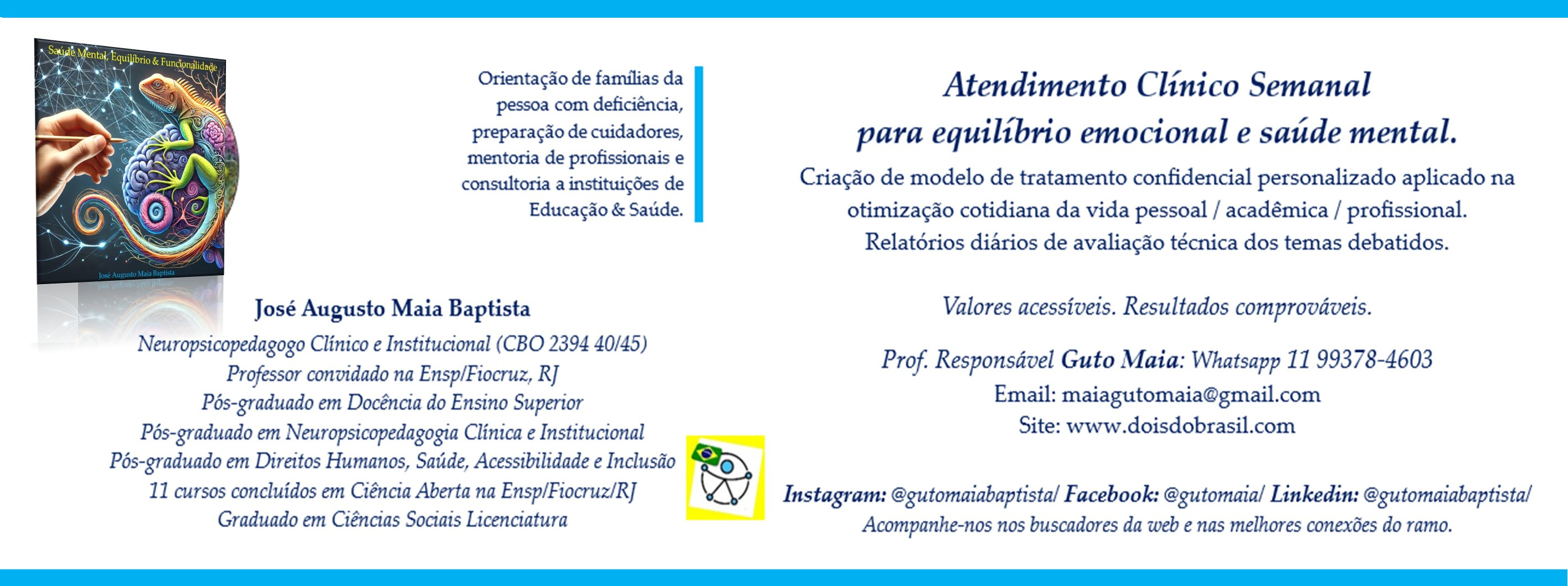 DESCRIÇÃO DA IMAGEM ACIMA: banner horizontal, em tira, com barras azul-claro na parte superior e na parte inferior, com logomarca redonda no alto, à esquerda, na mesma altura , mais ao cento, com alinhamento à direita, as palavras: “Orientação de famílias da”, (na linha abaixo): “pessoa com eficiência”, (na linha abaixo): “preparação de curadores”, (na linha abaixo): “mentoria de profissionais e”, (na linha abaixo): “consultoria a instituições de “Educação & Saúde”. Mais abaixo, o nome: “José Augusto Maia Baptista”, (na linha abaixo): “Neuropsicopedagogo Clínico e Institucional (CBO2394 40/45)”, (na linha abaixo): “Professor convidado na Ensp/Fiocruz, RJ”, “Pós-graduado em Docência do Ensino Superior”, (na linha abaixo): Pós-graduado em Neuropsicopedagogia Clínica e Institucional”, (na linha abaixo): “Pós-graduado em Direitos Humanos, Saúde, Acessibilidade e Inclusão”, (na linha abaixo): “11 cursos concluídos em Ciência Aberta, na Ensp/Fiocruz/RJ”; “Graduado em Ciências Sociais Licenciatura”. Na parte central inferior do banner, a logomarca quadrada do símbolo universal da deficiência, um círculo do Homem Vitruviano, de Da Vinci, reproduzido em desenho bastão infantil, com cabeça azul-claro, segurando uma bandeira do Brasil. O círculo está dentro e um quadrado branco, deslocado diagonalmente, dentro de outro quadrado maior de fundo amarelo. No lado superior direito, o texto: “Atendimento Clínico Semanal”, (na linha abaixo): para equilíbrio emocional e mental.”, (na linha abaixo): “Criação de modelo personalizado aplicado na otimização cotidiana”, (na linha abaixo): da vida pessoal/acadêmico/profissional.”, (na linha abaixo): “Relatório diário de avaliação técnica dos temas debatidos.”, (na linha abaixo): “Valores acessíveis. Resultados comprováveis.”, (na linha abaixo): “Prof. Responsável: Guto Maia: whatsapp 11 9937-4603”, (na linha abaixo): “Email: maiagutomaia@gmail.com”, (na linha abaixo): “Site: www.doisdbrasil.com”, (na linha abaixo): “Instagram: @gutomaiabaptista/ Facebook: @gutomaia/ Linkedin: @gurtomaiabaptista/”, (na linha abaixo): “Acompanhe-nos nos buscadores da web e nas melhores conexões do ramo.