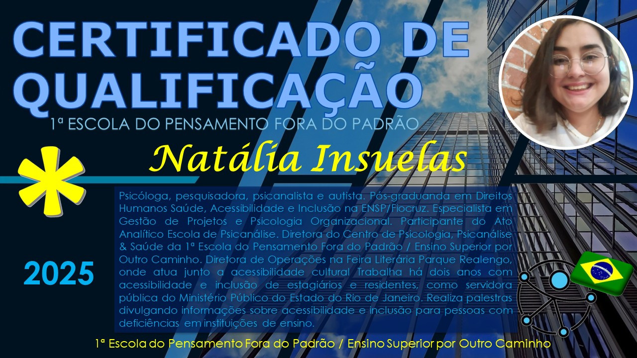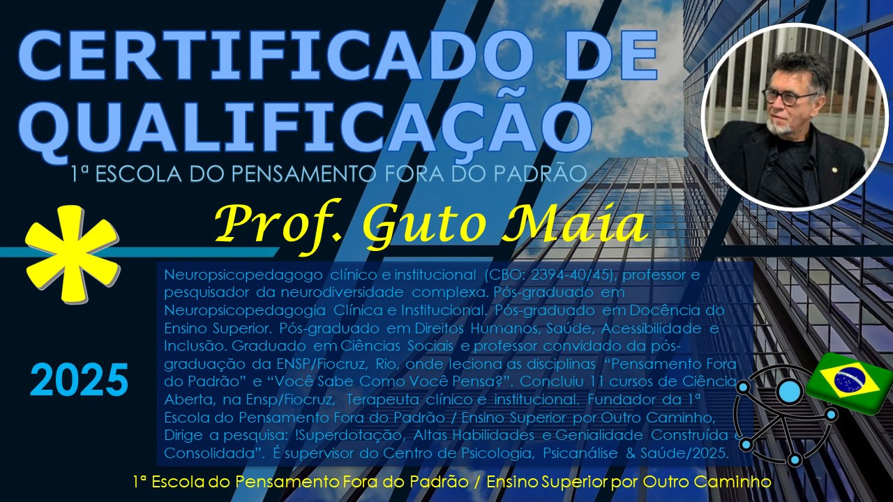 INSTRUÇÃO ÉTICA DE INVESTIGAÇÃO: Projeto Lab de pesquisa etnográfica empírica aberta iniciada em jan/2021, com previsão para 10 anos, desenvolvida por uma equipe interdisciplinar independente, sem vínculo formal ou verba oficial, que utiliza dados oficiais do Governo Federal, com inspiração no Movimento Mundial da CIÊNCIA ABERTA, buscando respeitar, disseminar e valorizar os fundamentos, diretrizes e preceitos de instituições de tecnologia de ponta reconhecidas como Fiocruz, OMS, UNESCO e ONU (17 ODS), com apoio criterioso da IA. Esta fase do projeto: “O PRINCÍPIO DA INTELIGÊNCIA ATIVA”: https://tr.ee/QcG9VG . É uma proposta de Educação Adaptada para adultos neurodivergentes em todas as áreas do Conhecimento. Trabalhamos a simplificação de conceitos e ressignificando terminologias. Start do projeto: fundação da 1ª Escola do Pensamento Fora do Padrão / Ensino superior por Outro Caminho, em 01/01/2021.