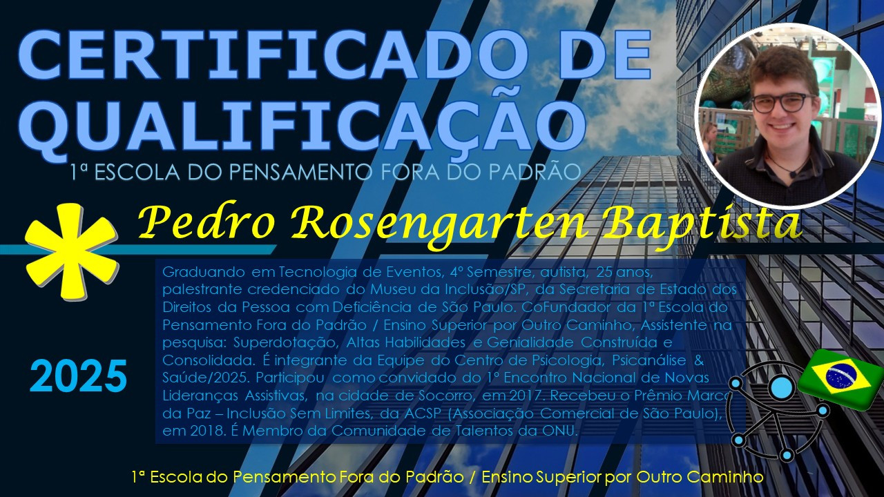 Projeto de educação adaptada em nível superior, especialmente, gestado durante a pandemia, quando todas as instituições ruíram. A intenção foi colocá-lo em contato com grandes pesquisadores, educadores e cientistas, pessoas diferenciadas por seus caráteres, que pudessem ser grandes exemplos para a formação superior de pessoas adultas, especialmente aquelas com deficiências intelectuais, que precisam de representatividade de fala, o que demanda uma inegociável Honestidade Intelectual Compreensiva da Adversidade, que não queria apenas aproveitar-se da vulnerabilidade alheia.