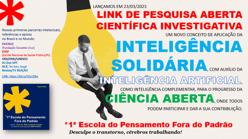 INSTRUÇÃO ÉTICA DE INVESTIGAÇÃO: Projeto Lab de pesquisa etnográfica empírica aberta iniciada em jan/2021, com previsão para 10 anos, desenvolvida por uma equipe interdisciplinar independente, sem vínculo formal ou verba oficial, que utiliza dados oficiais do Governo Federal, com inspiração no Movimento Mundial da CIÊNCIA ABERTA, buscando respeitar, disseminar e valorizar os fundamentos, diretrizes e preceitos de instituições de tecnologia de ponta reconhecidas como Fiocruz, OMS, UNESCO e ONU (17 ODS), com apoio criterioso da IA. Esta fase do projeto: “O PRINCÍPIO DA INTELIGÊNCIA ATIVA”: https://tr.ee/QcG9VG . É uma proposta de Educação Adaptada para adultos neurodivergentes em todas as áreas do Conhecimento. Trabalhamos a simplificação de conceitos e ressignificando terminologias. Start do projeto: fundação da 1ª Escola do Pensamento Fora do Padrão / Ensino superior por Outro Caminho, em 01/01/2021.