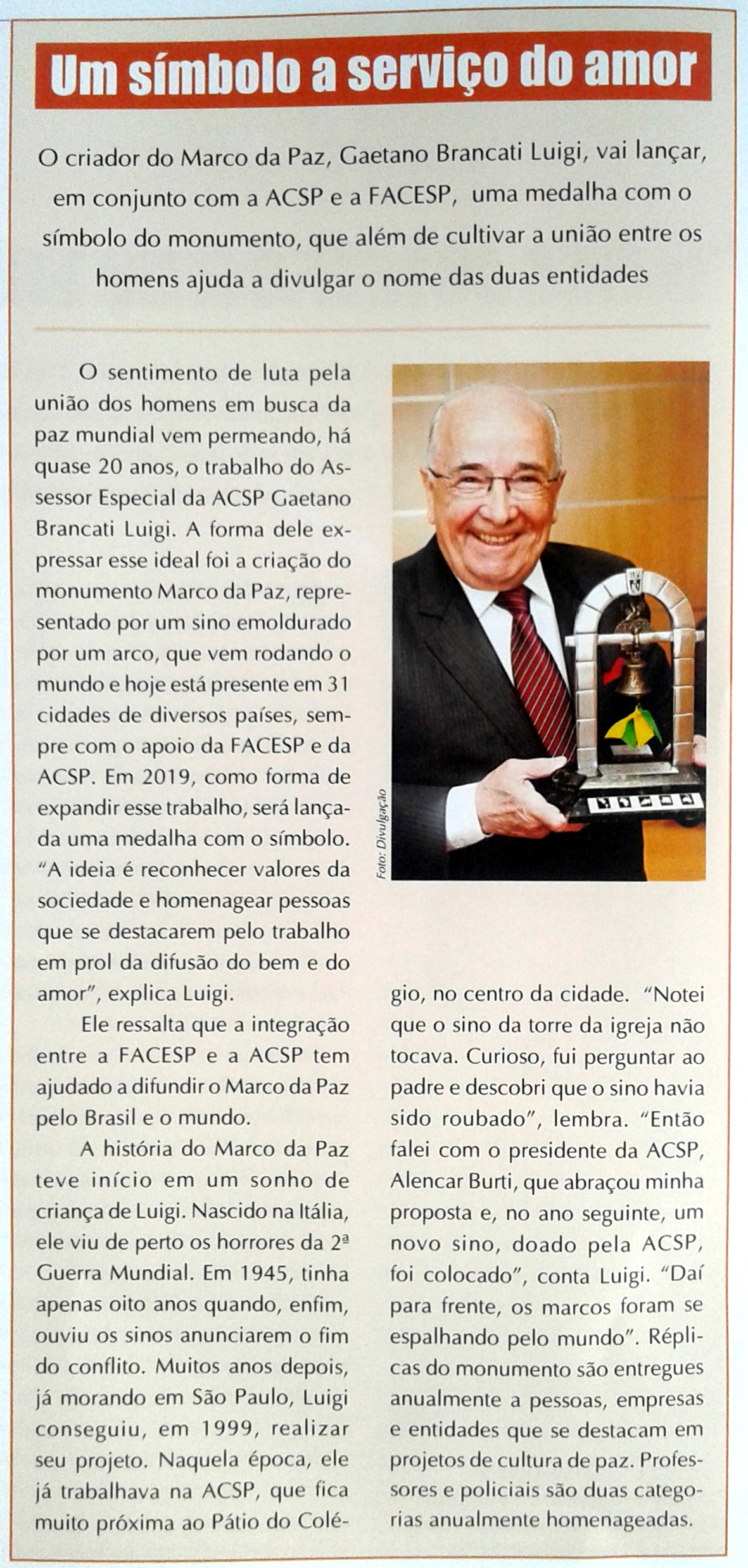 Ainda criança, com doze anos de idade, Luigi veio para a América, que era outro sonho. Após passagem pela Argentina, chegou ao Brasil, onde viveu e vive o maior tempo de sua vida. Com a imagem indelevelmente marcada, pelo passado inolvidável, projetava-se para o futuro e construía sua ideia, após sabichar por tantos anos. Luigi admirava, em 1999, a torre da Igreja do “Páteo do Collégio” e percebeu que o sino não tocava. Propôs-se com apoio da ACSP- Associação Comercial de São Paulo a colocar um novo e o fez com sucesso. É nesse momento, após 55 anos, no “Páteo do Collégio”, nas Terras de Piratininga, do Estado Bandeirante, onde o Padre Anchieta fez nascer uma das maiores Metrópoles do Mundo, a Cosmopolita São Paulo, que o sonho torna-se realidade. Concretiza-se o MARCO DA PAZ, com o seu SINO E A POMBA.